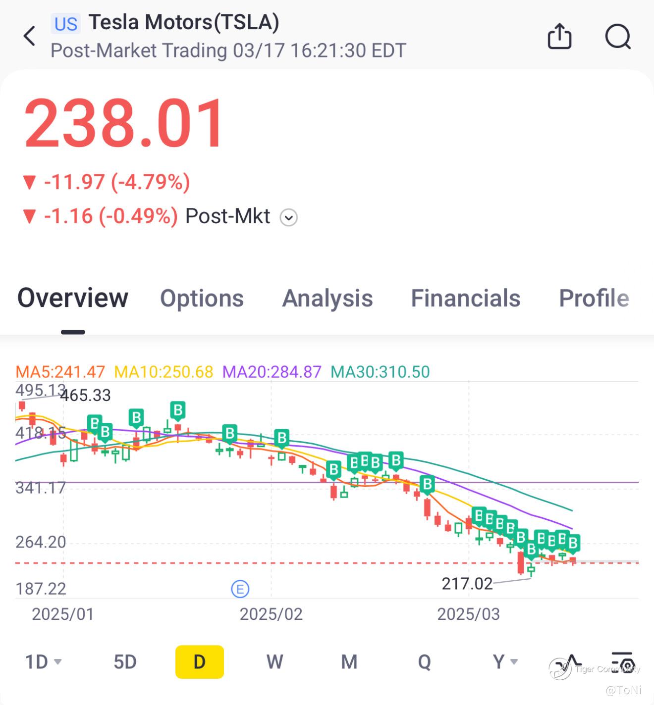 The current adjustment in Tesla’s stock price is largely driven by Musk’s political risks rather than any deterioration in the company’s fundamentals. This creates a “once-in-a-millennium opportunity” for investors. While Musk’s stance on the Ukraine issue has sparked controversy, its actual impact on Tesla’s operations is limited. Historically, similar political storms—such as Musk’s 2018 dispute with the SEC—have not derailed Tesla’s long-term growth trajectory. The post-market decline on March 17, 2025, may simply be an overreaction of market sentiment rather than a true reflection of Tesla’s value.