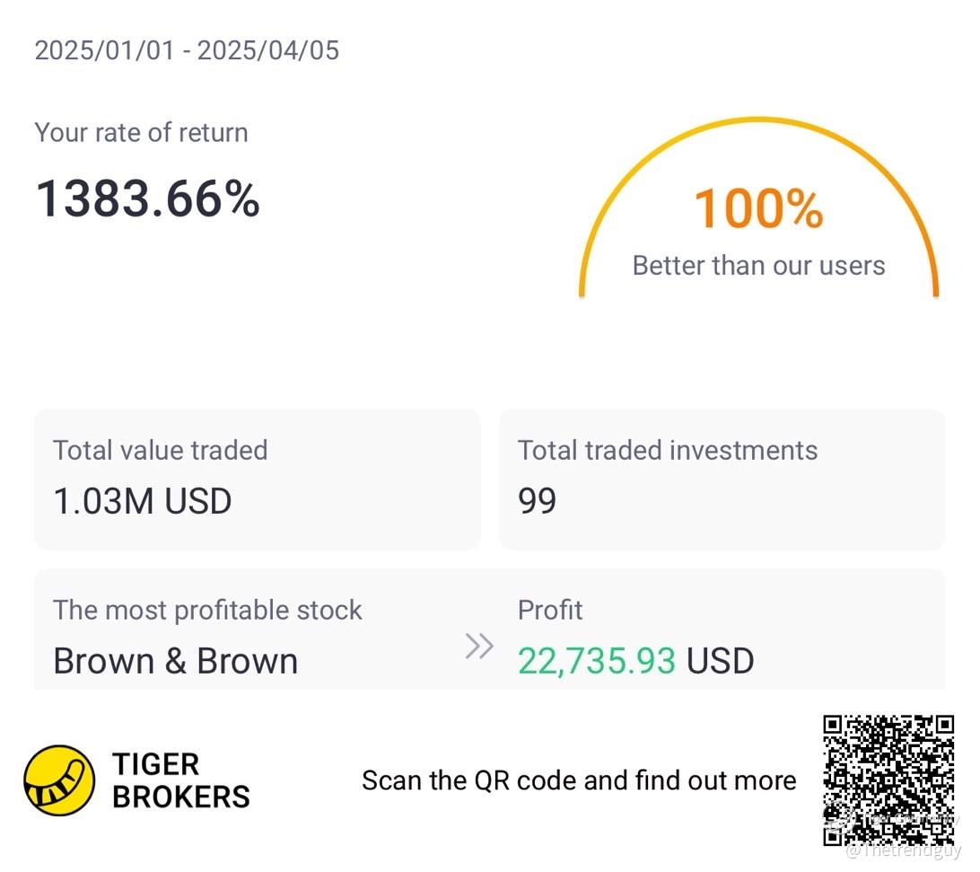 From January 1 to April 5, my trades delivered a 1383.66% return—outperforming 100% of users on Tiger Brokers.