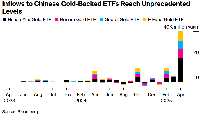 Beyond futures speculation, investors are stockpiling gold in other forms. Inflows into local gold ETFs this month have already outpaced all of last year. The Shanghai gold premium over global prices has surged to record highs.