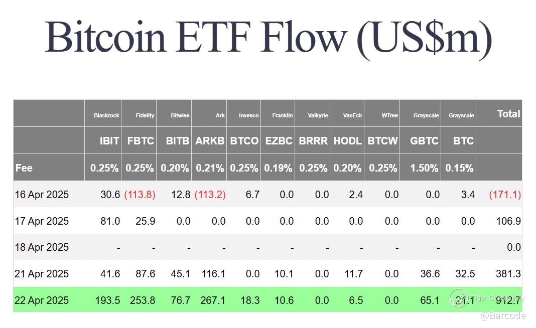 β’ U.S.-listed Bitcoin ETF inflows, $381.3M (21 April), $912.7M (22 April)