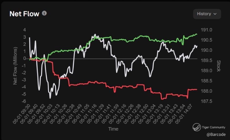 On 01May25, early net outflows reversed by midday. The stock moved from $188 to $190.50 with rising green flow. Options flow confirms it:
