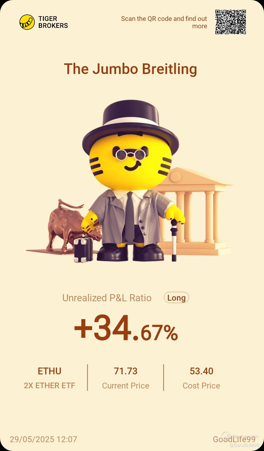 $2X ETHER ETF(ETHU)$ sharing for coins, hoping it continue moving to the π π π π direction, wish I can join the Tiger's group who hold profit >100% soon, but patient is the π [LOL]