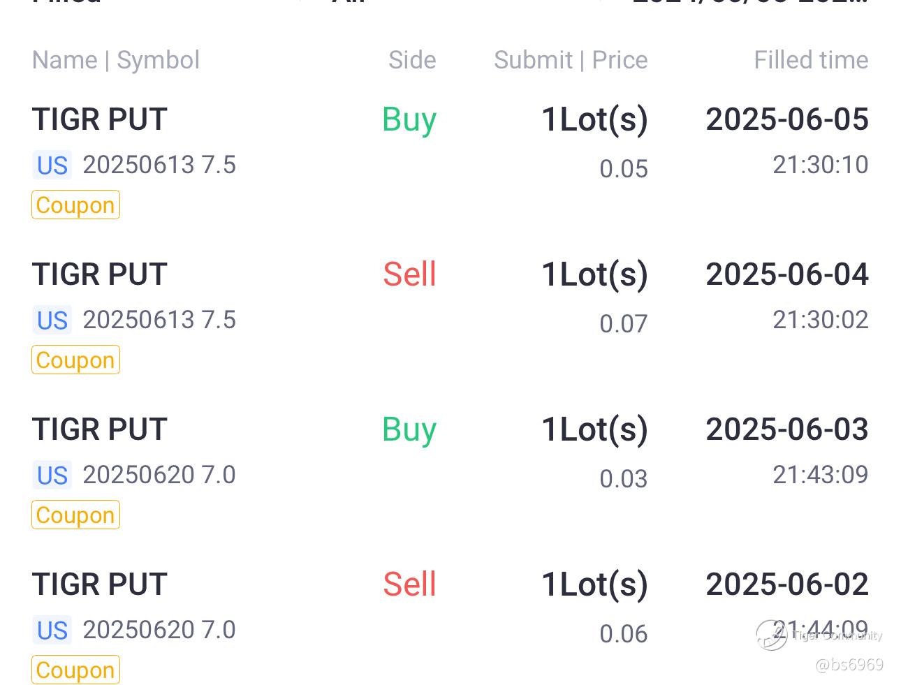 On June 2, I kicked things off by selling 1 TIGR PUT option (strike $7.0, expiring 2025-06-20) at $0.06. With minimal capital tied up and low volatility risk, this put was just strong enough to earn me instant premium while staying close to the money for high time decay. Like grinding coffee beans, the initial prep was essential for that smooth profit.