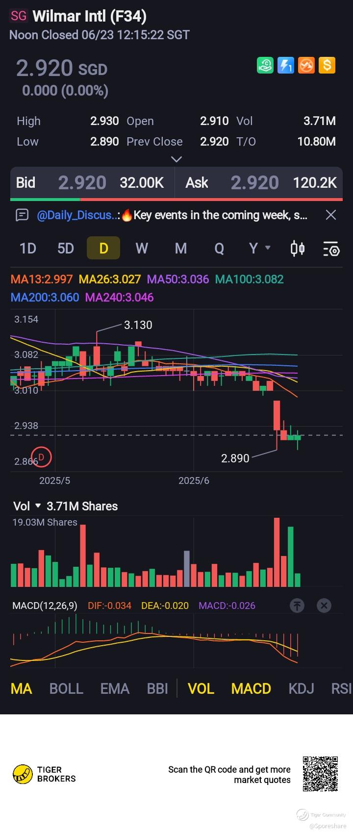Wilmar Intl - Chart wise, bearish mode. If 2.88 cannot hold, she may goes down to test 2.80 and below!
