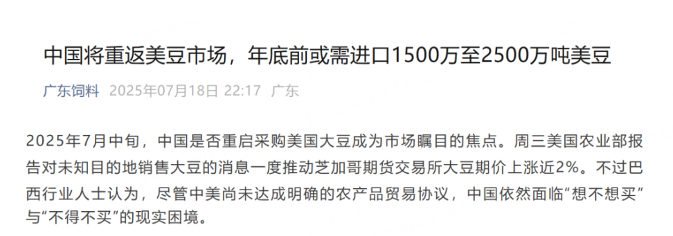 While reviewing industry websites over the weekend, I realized that China-U.S. agricultural trade has been interrupted for a substantial period. China has not purchased U.S. soybeans for a long time. However, as the world’s largest soybean buyer, China’s recovering consumption means relying solely on purchases from Brazil and Argentina can no longer meet its demand. Back when China-U.S. trade was normalized, China sourced about 50% of its soybeans from the U.S., but now this figure has dropped to nearly zero, with Brazil and Argentina fully supporting the trade. Should the China-U.S. tariff issue be resolved, it would mark a gradual normalization of trade between the two nations, and China resuming imports of U.S. agricultural products would become a priority to ease domestic supply shortages.