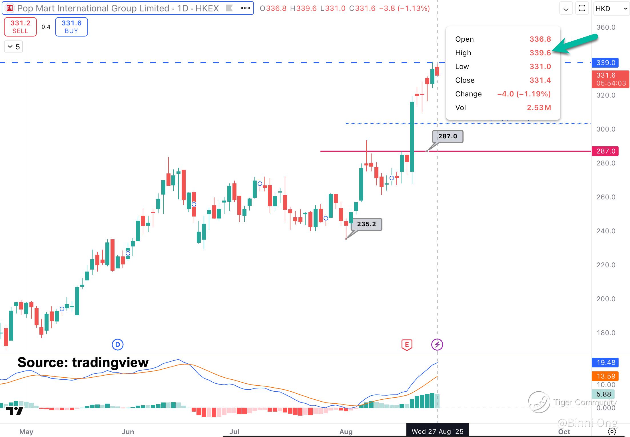 Rose from HKD 320 to HKD 339 (highest reached was 339.8).