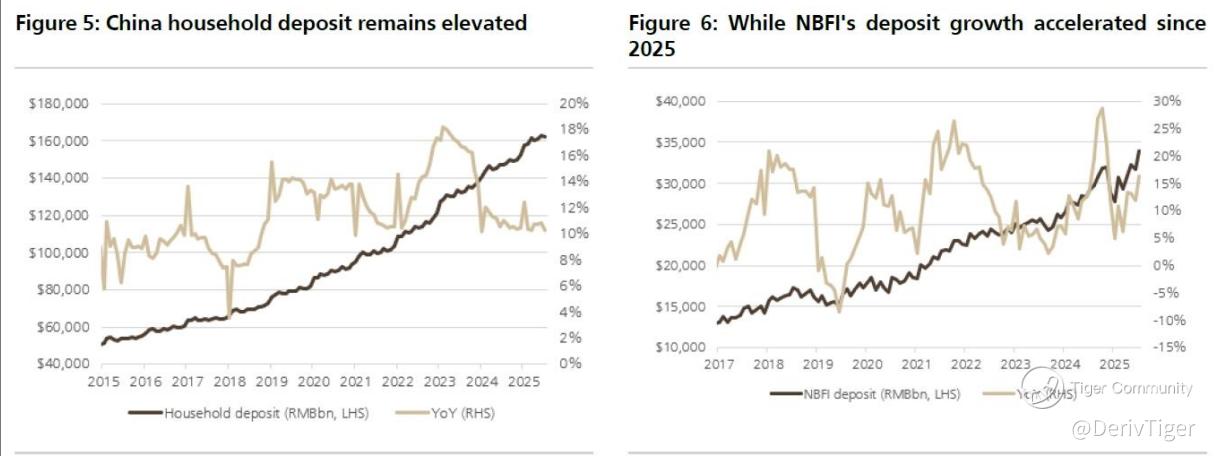 Turning from U.S. equities to Greater China—the recent global leader in performance—we maintain our view from last week: this is a liquidity-driven bull market. Structurally, insurers, mutual funds, private equity, and Central Huijin have all participated and contributed capital inflows. According to UBS estimates, by Q2 2025, Chinese insurance funds’ equity investments reached RMB 4.7 trillion, an increase of more than RMB 620 billion compared with year-end 2024, marking a clear acceleration from previous growth rates. In addition, since early 2024, although China’s total household deposits have remained at elevated levels, their growth rate has slowed significantly. Meanwhile, deposits at non-bank financial institutions have not only rebounded over the past two years but also show signs of accelerating. In other words, there is evidence that household savings may be flowing into the capital market indirectly through wealth management products, insurance, and other non-bank channels—providing additional liquidity to support the rally.