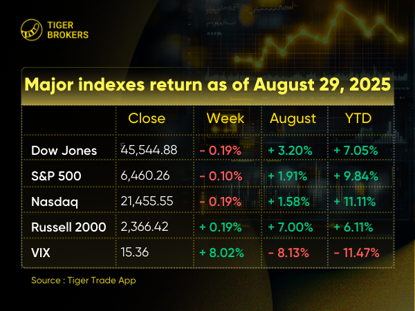Sectors: Six of the S&P 500’s 11 sectors advanced last week. Energy led gains, supported by firm crude prices and export demand, while Utilities lagged as investors rotated away amid rising rate-cut expectations. Looking at August overall, most sectors contributed positively, especially Tech, Consumer Discretionary, and cyclicals.