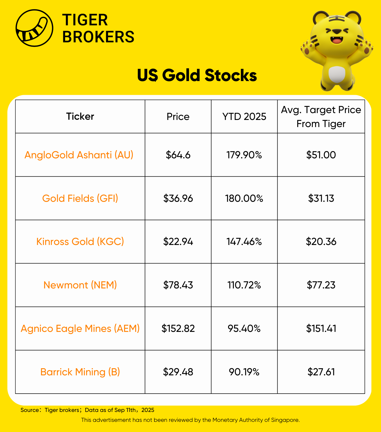 US Gold Stocks: The six companies selected are major gold mining firms with a market capitalization exceeding USD 10 billion and ranked among the top six by market value year-to-date. They represent some of the world’s largest and most liquid gold producers, offering direct exposure to gold prices through mining operations. Here are the stocks to watch: $Anglogold Ashanti(AU)$ $Gold Fields(GFI)$ $Kinross(KGC)$ $Newmont Mining(NEM)$ $Agnico Eagle Mines(AEM)$ $Barrick Mining Corporation(B)$