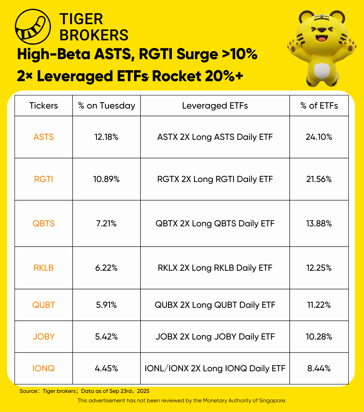 Leveraged stocks shines: $Tradr 2X Long ASTS Daily ETF(ASTX)$ , $Rigetti Computing(RGTI)$ , $D-Wave Quantum Inc.(QBTS)$ , $Rocket Lab USA, Inc.(RKLB)$ , $Quantum Computing Inc.(QUBT)$ , $Joby Aviation, Inc.(JOBY)$ , $IONQ Inc.(IONQ)$.