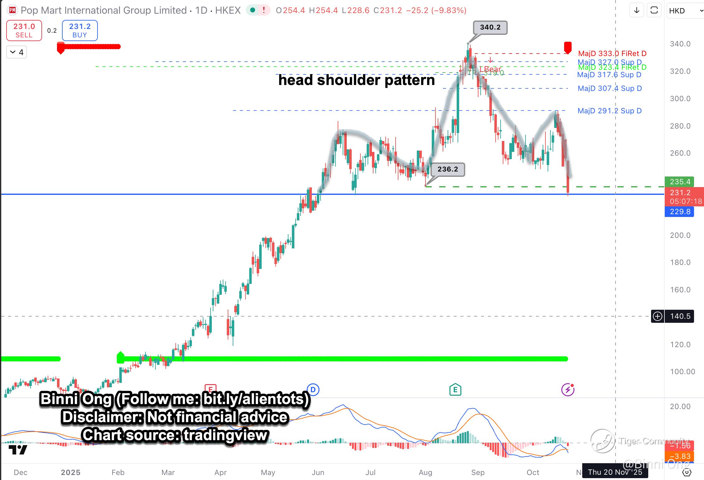 $POP MART(09992)$ formed a Head and Shoulders pattern, a classic technical setup that often signals potential trend reversal after a strong rally.