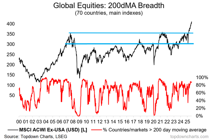 Took a while, but global equities (ex-US) finally have broken out to new highs and with improving breadth.