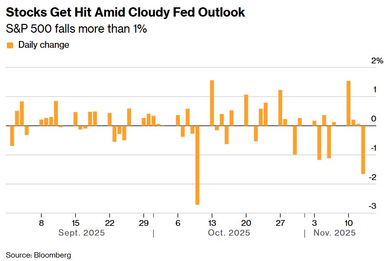 Heavy selling resumed on Wall Street, halting a weeklong respite spurred by the US government reopening, as hawkish statements from Federal Reserve officials ahead of a deluge of economic data spurred traders to dump risky assets from tech stocks to crypto.