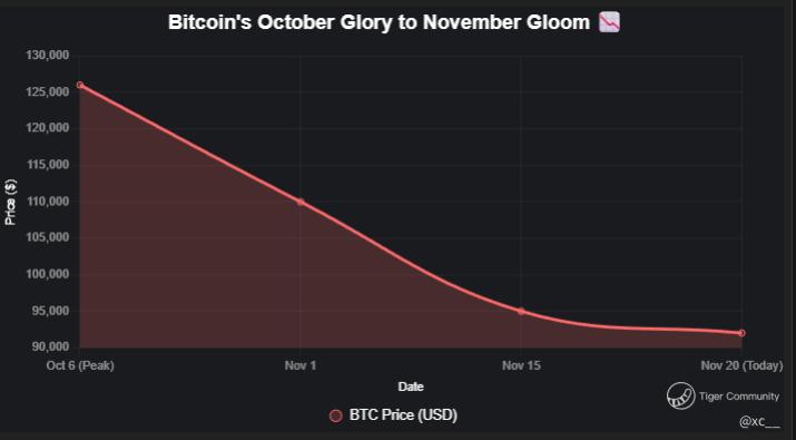 Whoa, hold onto your wallets, folks! 😱 Bitcoin's wild ride from that jaw-dropping $126K peak in early October has turned into a heart-stopping nosedive, slashing over $1 trillion from the entire crypto market's value. We're talking a brutal 27% wipeout, erasing every ounce of 2025's gains and leaving BTC hovering around $92K today. It's like watching your favorite rollercoaster flip upside down—terrifying, but is this the ultimate buying opportunity? 🌪️