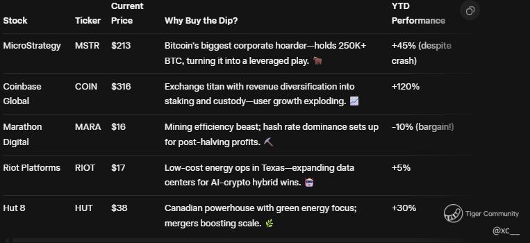 MSTR's basically a BTC proxy on steroids—every dip is their gain. COIN? It's the gateway drug for normies entering crypto, with trading volumes rebounding. Miners like MARA and RIOT? Undervalued at these levels, as Bitcoin's security needs only grow. Load up if you're bullish long-term; these could 3-5x as adoption accelerates.