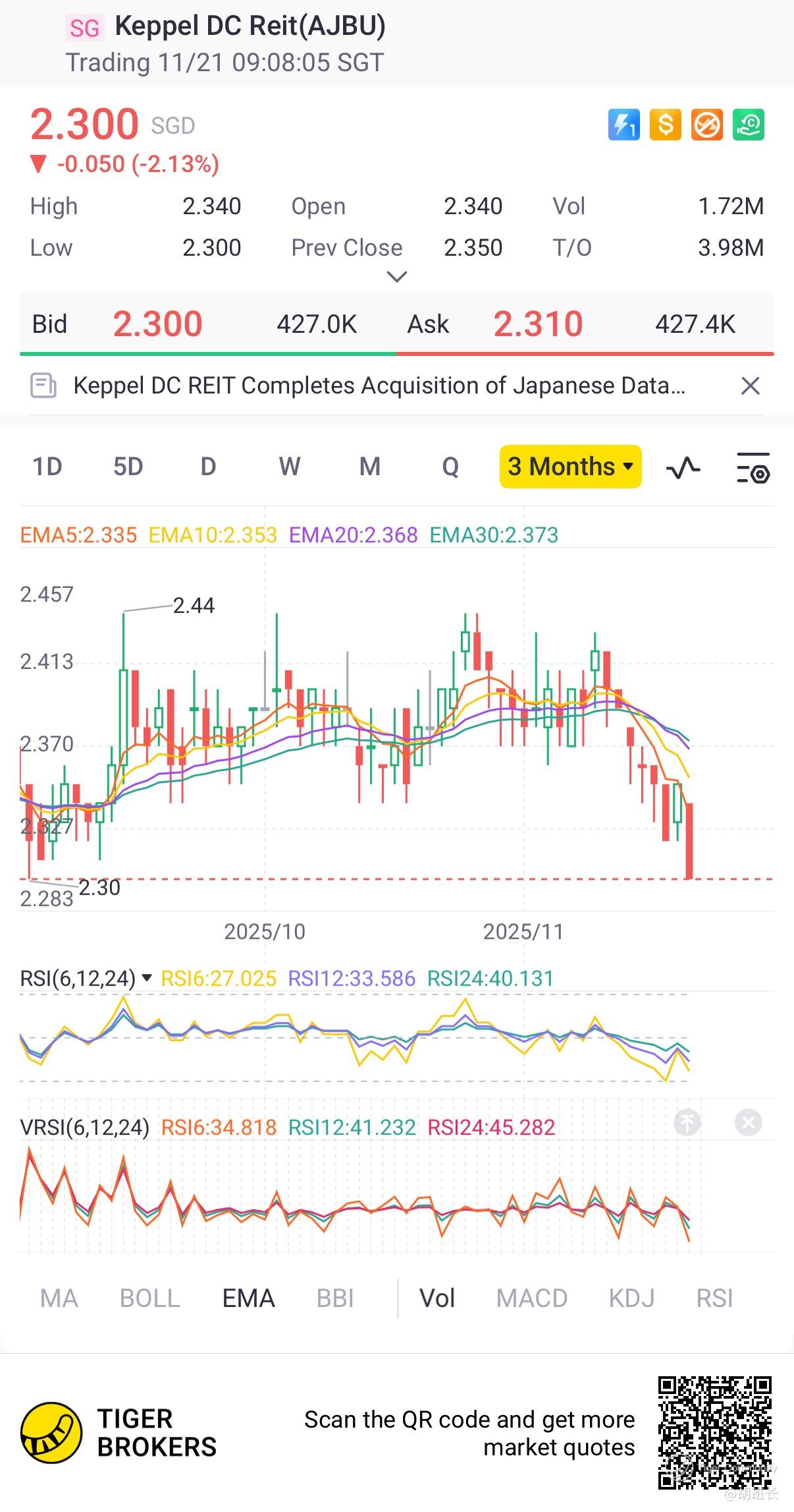 $Keppel DC Reit(AJBU.SI)$  3-month low