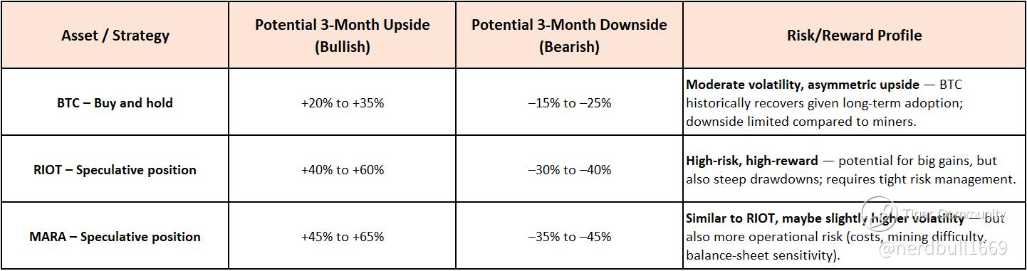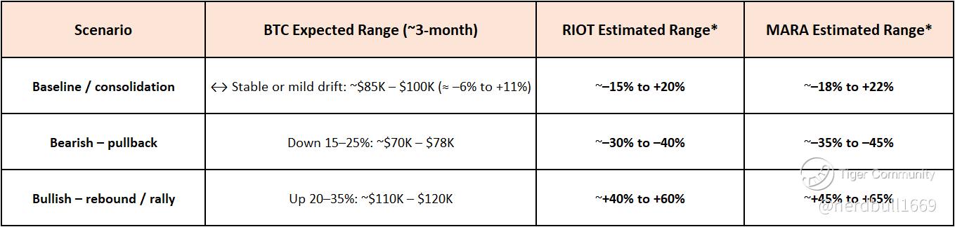 *These multipliers for RIOT and MARA are rough, based on their historical “beta / volatility amplification” relative to BTC. For example: a moderate BTC move (±10%) could translate to ±20–30% for miners; larger BTC swings get amplified more. This aligns with documented patterns of “miners swing 2–4× BTC moves.”