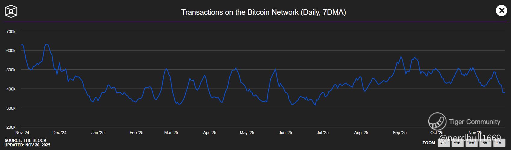 Next, we looked at the transactions on the Bitcoin Network based on 7DMA, which is showing similar pattern, if you noticed, when Bitcoin prices are trading above the $100K mark, we could see a stronger transaction trend on the Bitcoin network.