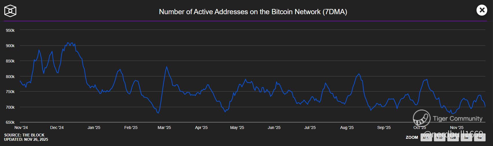 Another way we can look at is the number of active addresses on the Bitcoin Network based on 7DMA, we are seeing a slight pickup but then it went down again.