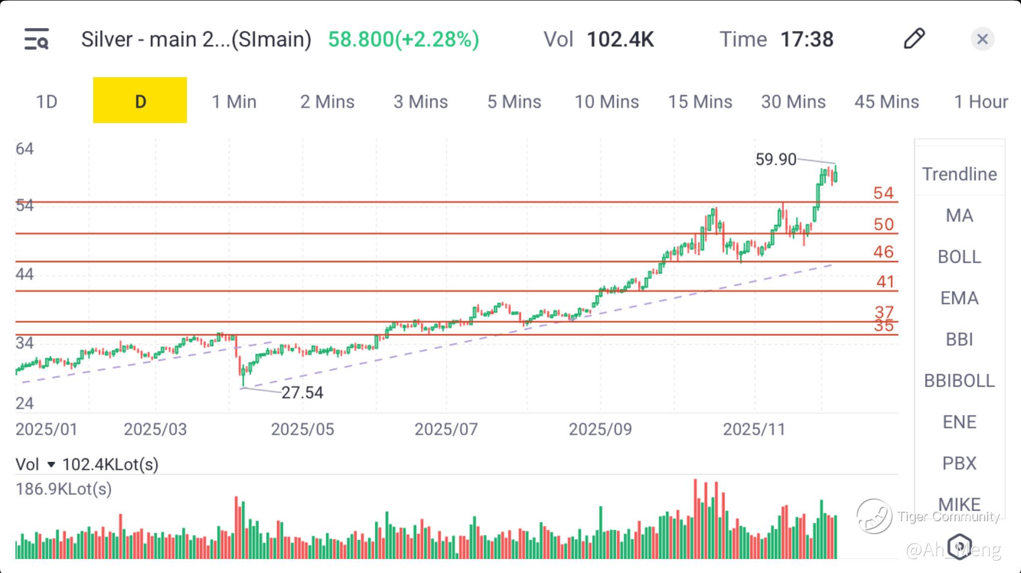 In the short term, $60 is definitely the next resistance. Clearing it easily would see this match continue towards $70-80 range. Is $100 within reach for silver this month (end 2025)? Don't think so... or I hope not... that is a 40% from where we stand now, definitely not for a commodity. Having said that, I see $100 as an ideal mid term target for silver if it is to play an important role in the new economy. Not just silver, but platinum and palladium could accelerate their price increases as their usage continues to grow in the new economy. We can get a sense as the price of copper has also quietly moved up.