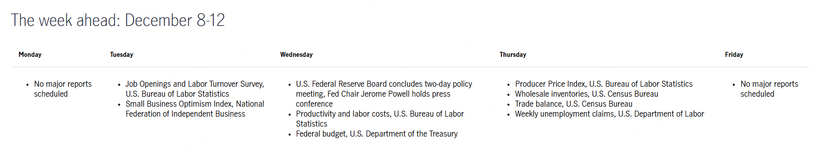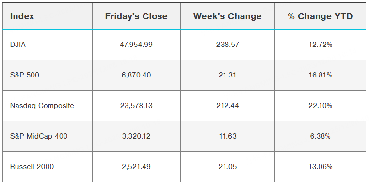 U.S. equities extended their rally into the first week of December, with the Nasdaq Composite (+0.91%) and Russell 2000 (+0.84%) leading and the S&P 500 posting a smaller gain. Light volumes underscored cautious optimism that the Federal Reserve will cut rates at its upcoming meeting. Treasury prices fell as longer-dated yields rose, while high-yield bonds advanced and munis outperformed Treasuries despite heavy supply.