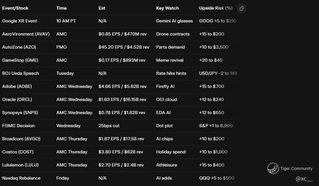 $Lululemon Athletica(LULU)$ $Adobe(ADBE)$ $S&P 500(.SPX)$ $Broadcom(AVGO)$ $Alphabet(GOOG)$ $Oracle(ORCL)$ Markets kicked off the week with a cautious spark, S&P futures edging 0.1% higher amid Fed cut fever at 87% odds and QT's $1T liquidity flood supercharging risk assets. Asia mixed with Nikkei up 0.3% on easing bets, while Bitcoin dipped 1% to $85K testing support. Key catalyst? Google's Android XR Event today unleashes updates for smart glasses, headsets, and Gemini AI features – previews hint at spatial computing breakthroughs like real-time overlays and voice commands for AR glasses, potentially boosting Alphabet's XR ecosystem to $50B rev by 2028. Tuesday's earnings barrage from AeroVironment, AutoZone, and GameStop; BOJ Governor Ueda's speech; Wednesday's Adobe, Oracle, Synopsys reports plus FOMC's monetary policy decision (quarter-point cut to 3.5%-3.75% expected); Thursday's Broadcom, Costco, Lululemon; Friday's Nasdaq-100 reconstitution. This week's gauntlet could catapult AI/cloud plays 15%+ if beats land, but PCE misses risk VIX spikes to 30. Let's shred the surge, spotlight stocks, and map trades to crush the chaos. 😎📊