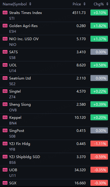 Singapore stocks opened higher on Tuesday. STI rose 0.1%; Nio rose 1%; SingPost fell 1%.