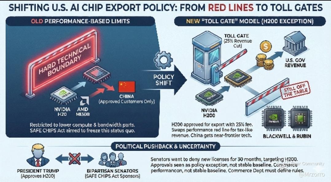 $NVIDIA(NVDA)$ just won political cover to ship its H200 AI accelerator to approved customers in China, with President Trump saying the United States will take a 25% cut of revenue on those chips and applying a similar framework to $Advanced Micro Devices(AMD)$