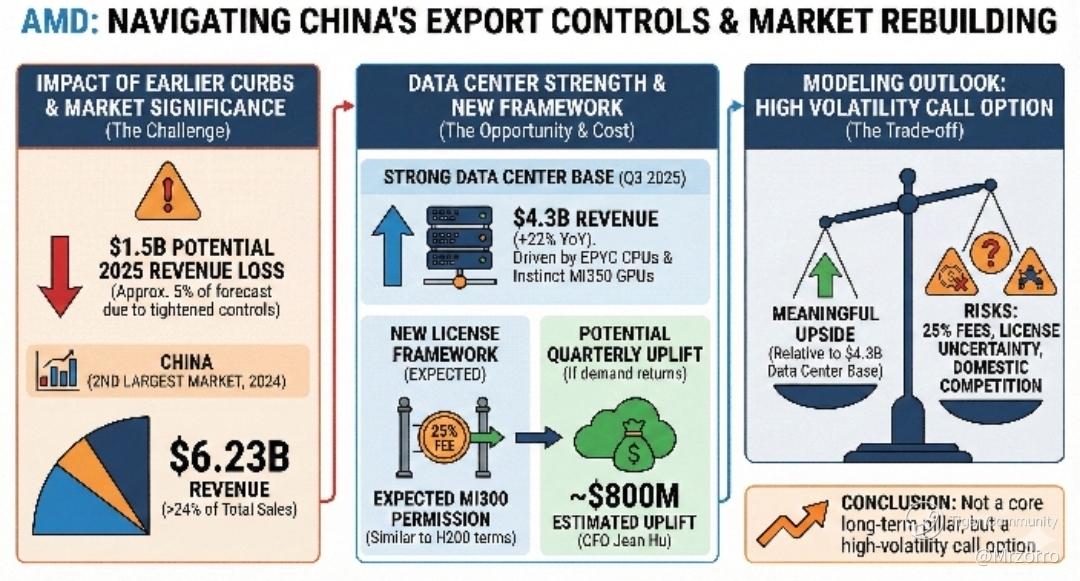For modeling, that means China re entry is a real but high volatility call option for AMD: the upside is meaningful relative to a 4.3 billion dollar per quarter Data Center base, but the fees, license uncertainty and competition from domestic China accelerators mean it should not be treated as a core pillar of the long term story.