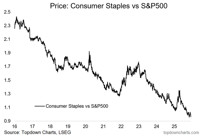 Here's the relative performance line for consumer staples -- you can see how the extremes in relative value were created.