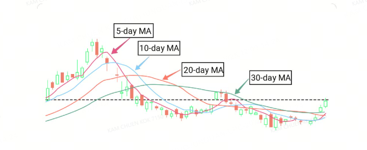 The MA's position relative to the price candles (K-Lines) gauges the market's immediate strength and generates trading signals, such as those formalized in Granville's Eight Rules (four buy, four sell).