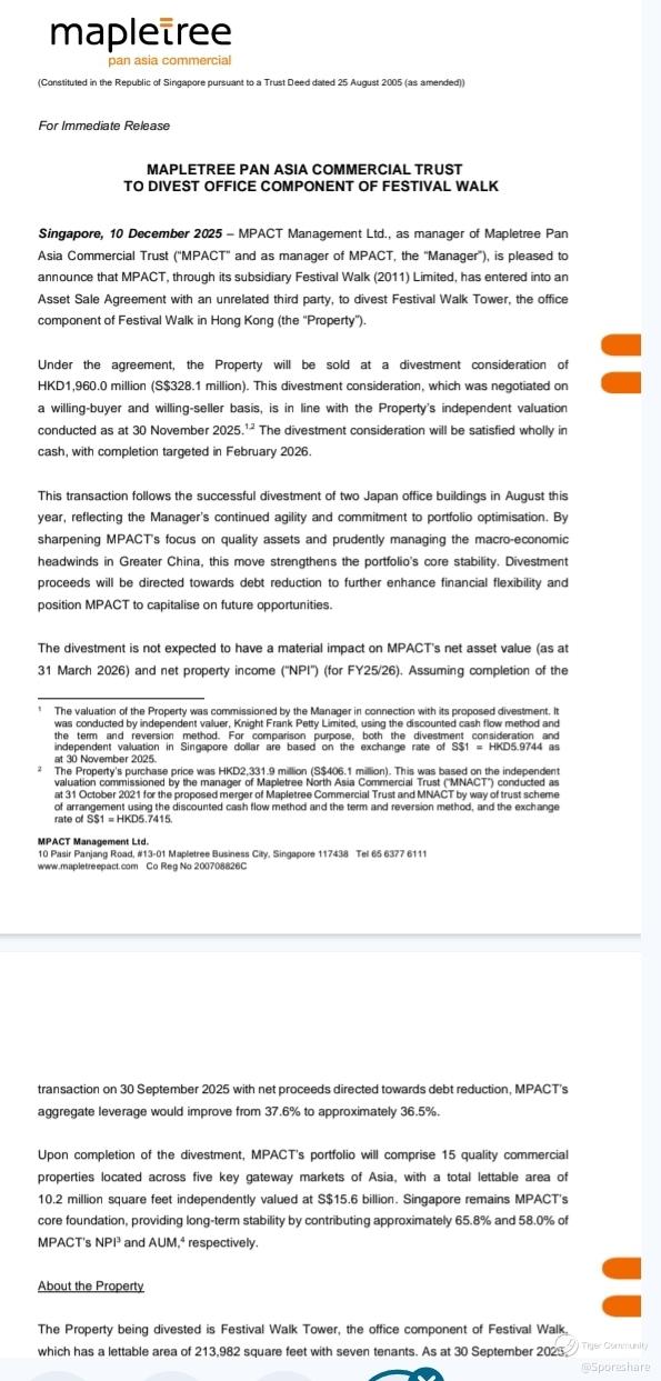 Mapletree PanAsia - Divestment of Festival Walk in HK office assets to 3rd party for 1960m HK about SGD 328.1m.