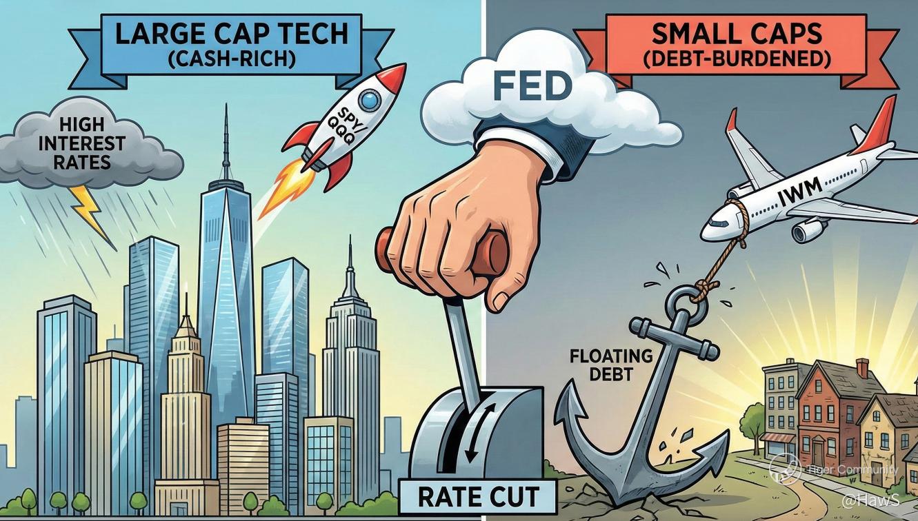 For the past two years, the stock market has been a tale of two cities. Large-cap tech stocks ( $SPDR S&P 500 ETF Trust(SPY)$ , $Invesco QQQ(QQQ)$ ) soared, immune to high interest rates because they are cash-rich and hold almost no debt. Meanwhile, small businesses and the Russell 2000 ( $iShares Russell 2000 ETF(IWM)$ ) have been suffocated. The Fed's recent rate cut changes the economic physics for small companies overnight.