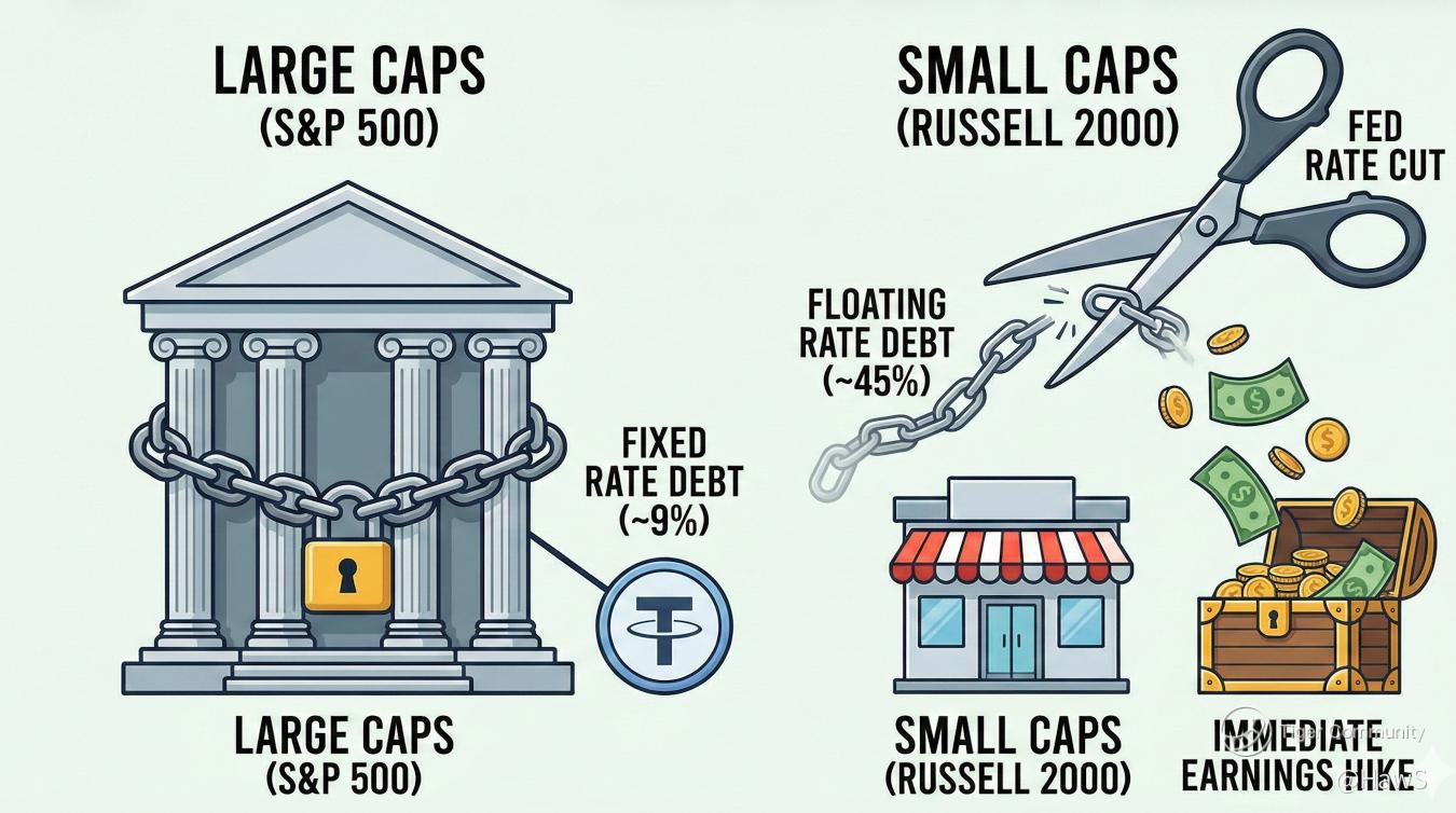Large Caps (S&P 500): These giants locked in low, fixed rates years ago. Only ~9% of their debt is "floating" (variable) rate. A Fed cut doesn't help them much because they were never paying high rates to begin with.