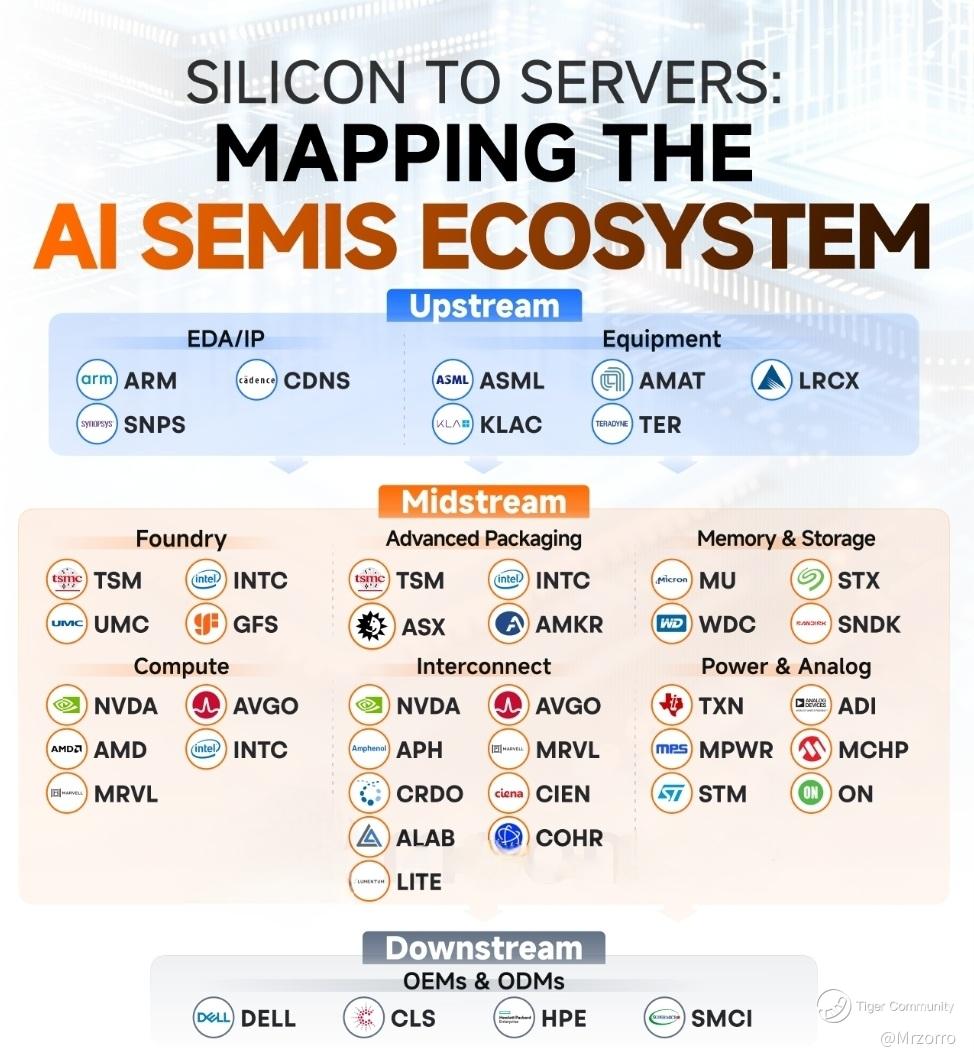 Increasing power density in AI racks creates a robust cycle for power management suppliers, with liquid cooling penetration expected to approach 47% in 2026 alongside more than 20% growth in AI server shipments. This complexity supports 20 to 30% data center revenue growth for companies like $Texas Instruments(TXN.US)$ , $Analog Devices(ADI.US)$ , $Monolithic Power Systems(MPWR.US)$ , and $Microchip Technology(MCHP.US)$ , while $ON Semiconductor(ON.US)$ and $STMicroelectronics(STM.US)$ benefit from silicon carbide applications in power infrastructure. This sector represents a quiet but durable winner, driven by rising rack level power budgets rather than just headline GPU volumes.