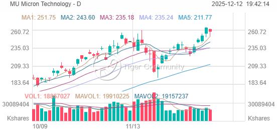 Micron closed at $258.46 on December 12th (EST), down -1.99% (-$5.25), just $6.29 below its 52-week high of $264.75.