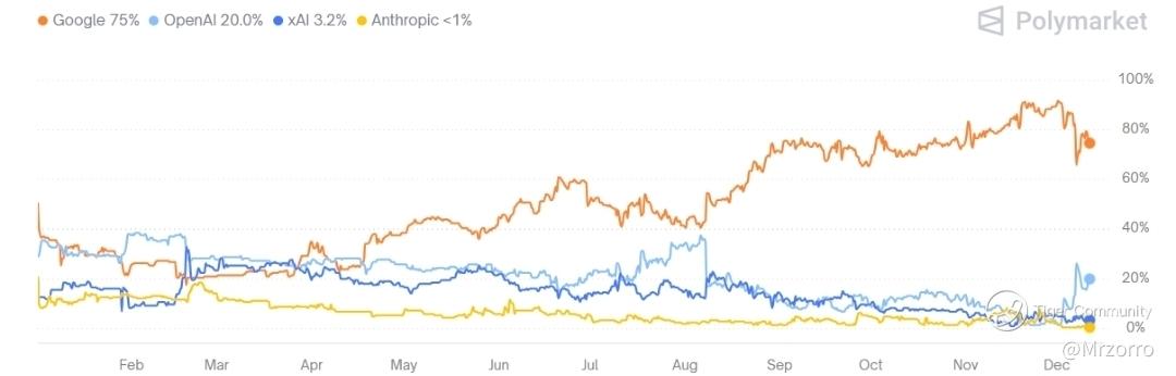By year-end, AI leadership had become a three-way fight between OpenAI, $NVIDIA (NVDA.US)$, and $Alphabet-C (GOOG.US)$— and Polymarket data confirms the race is far from settled.