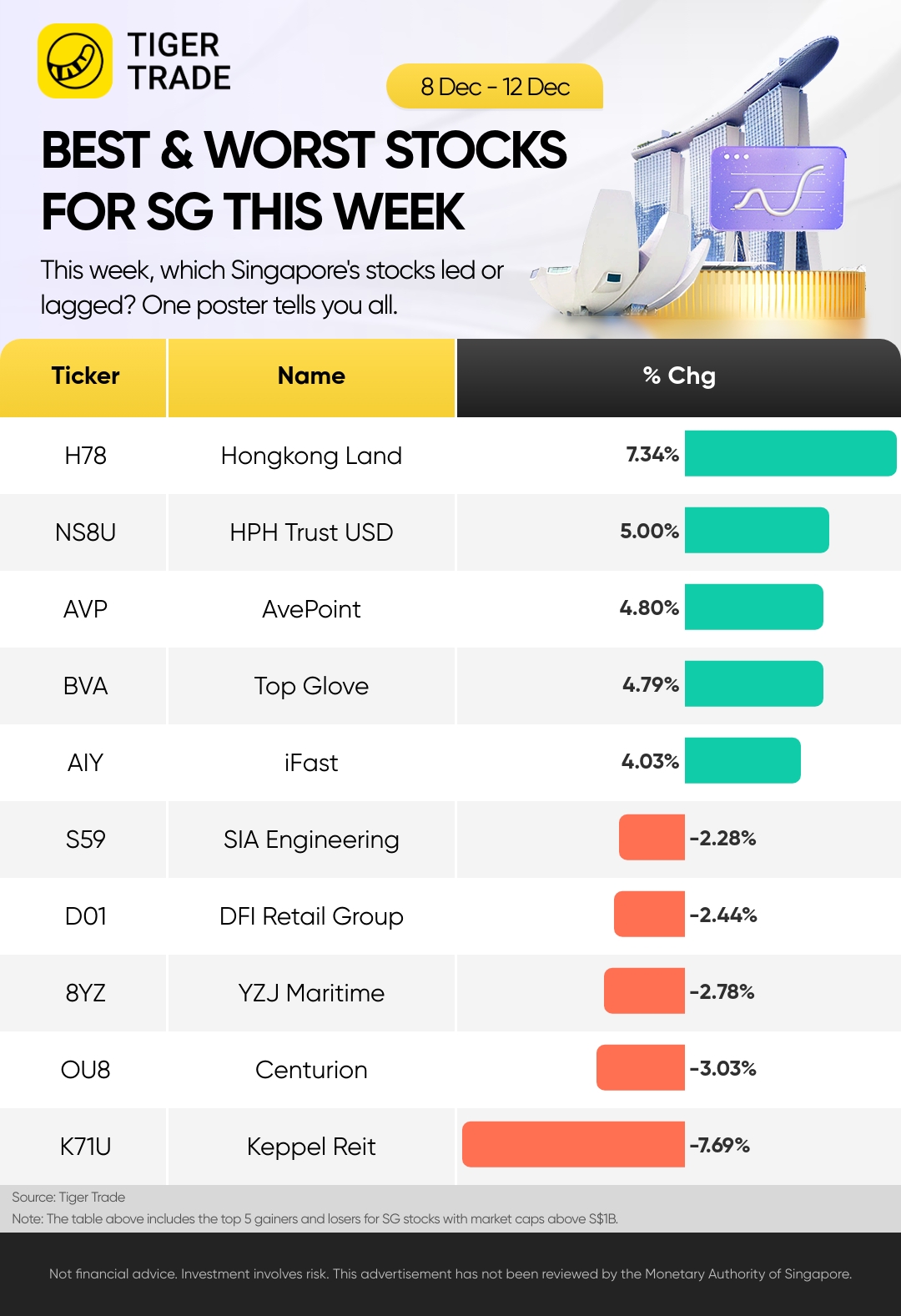 In terms of individual stocks, $HongkongLand USD(H78.SI)$ rose 7%, $HPH Trust USD(NS8U.SI)$, $AvePoint(AVP.SI)$ and $Top Glove(BVA.SI)$ rose 5%, $IFAST(AIY.SI)$ rose 4%; while $Keppel Reit(K71U.SI)$ fell 8%, $Centurion(OU8.SI)$ and $YZJ Maritime(8YZ.SI)$ fell 3%, and $DFIRG USD(D01.SI)$ and $SIA Engineering(S59.SI)$ fell 2%.