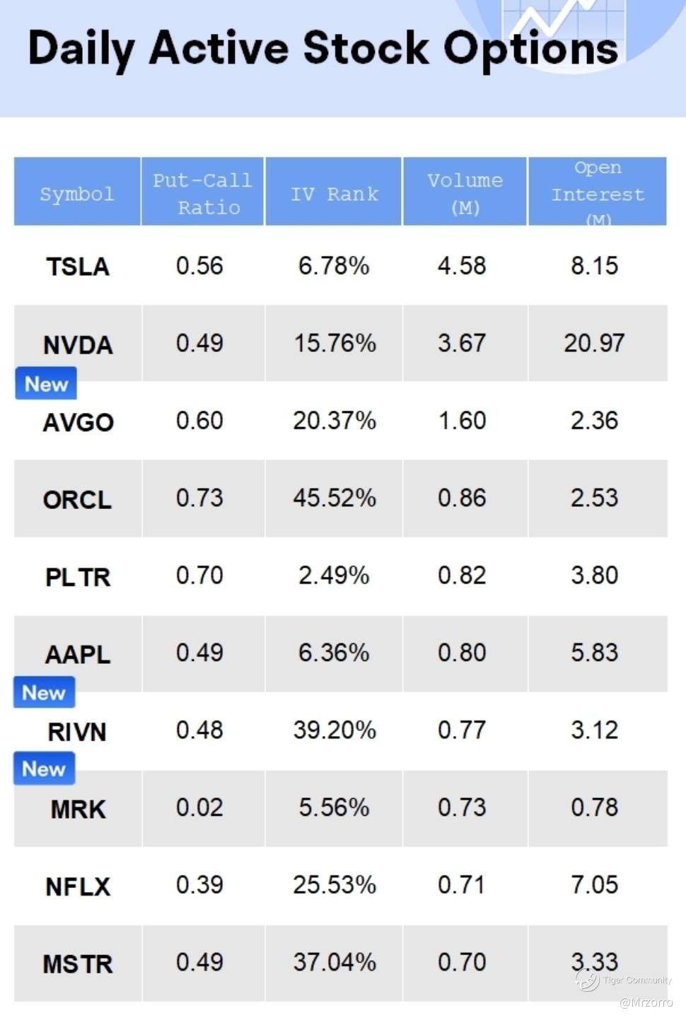 $Tesla Motors(TSLA)$ ranked first with a neutral put/call ratio of 0.56 and a low IV rank of 6.78%, reflecting optimistic bets as volume totaled 4.58 million contracts against 8.15 million in open interest. Tesla bucked the broader market decline, rising 2.7% to provide a confidence boost for investors.