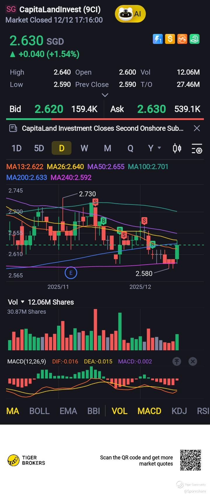 CapLand Investment (9CI.SI) - She may rise up to reclaim 2.70 than 2.73!