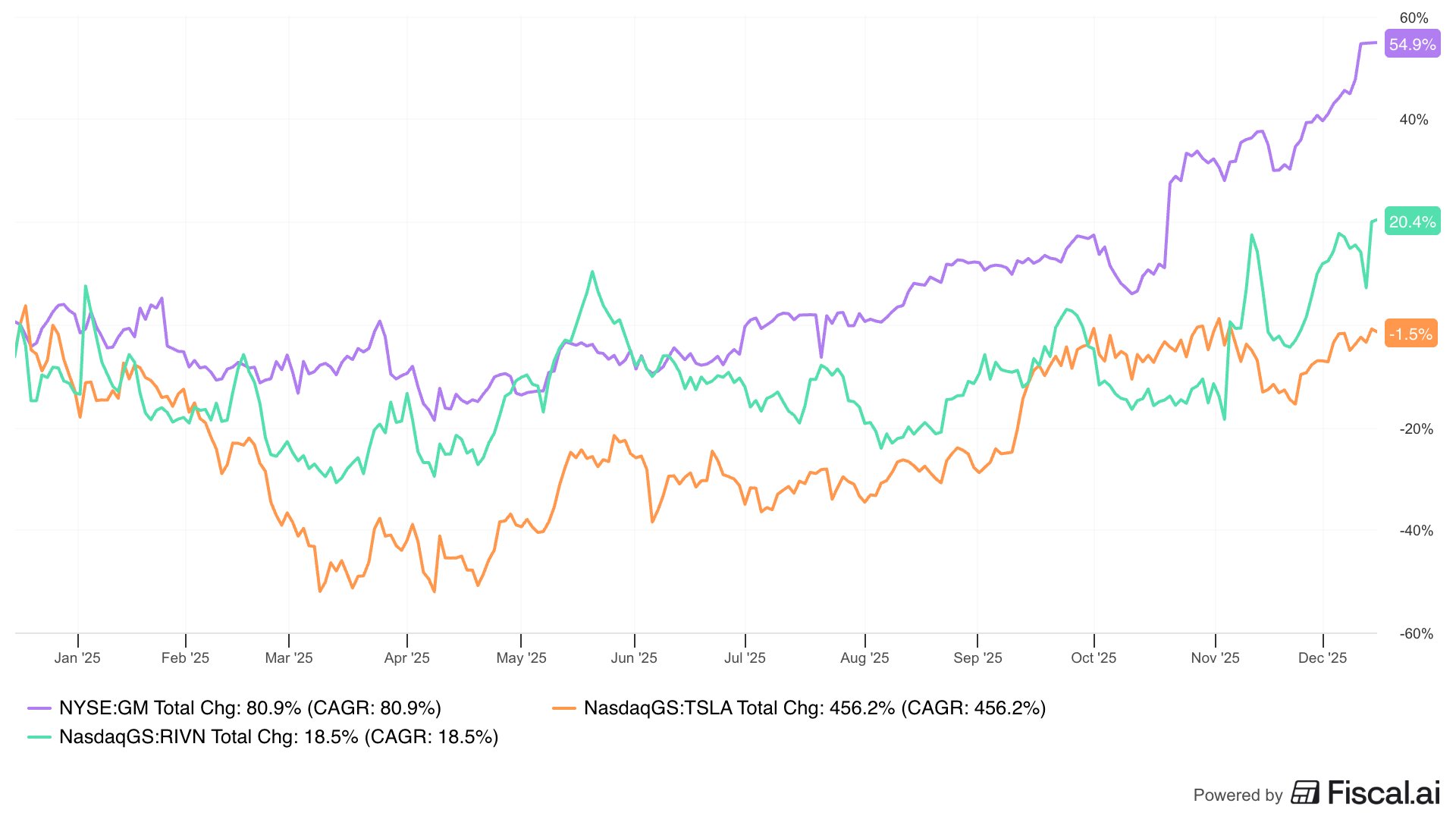 $General Motors(GM)$ beating $Tesla Motors(TSLA)$ and $Rivian Automotive, Inc.(RIVN)$ by a wide margin over the past year.