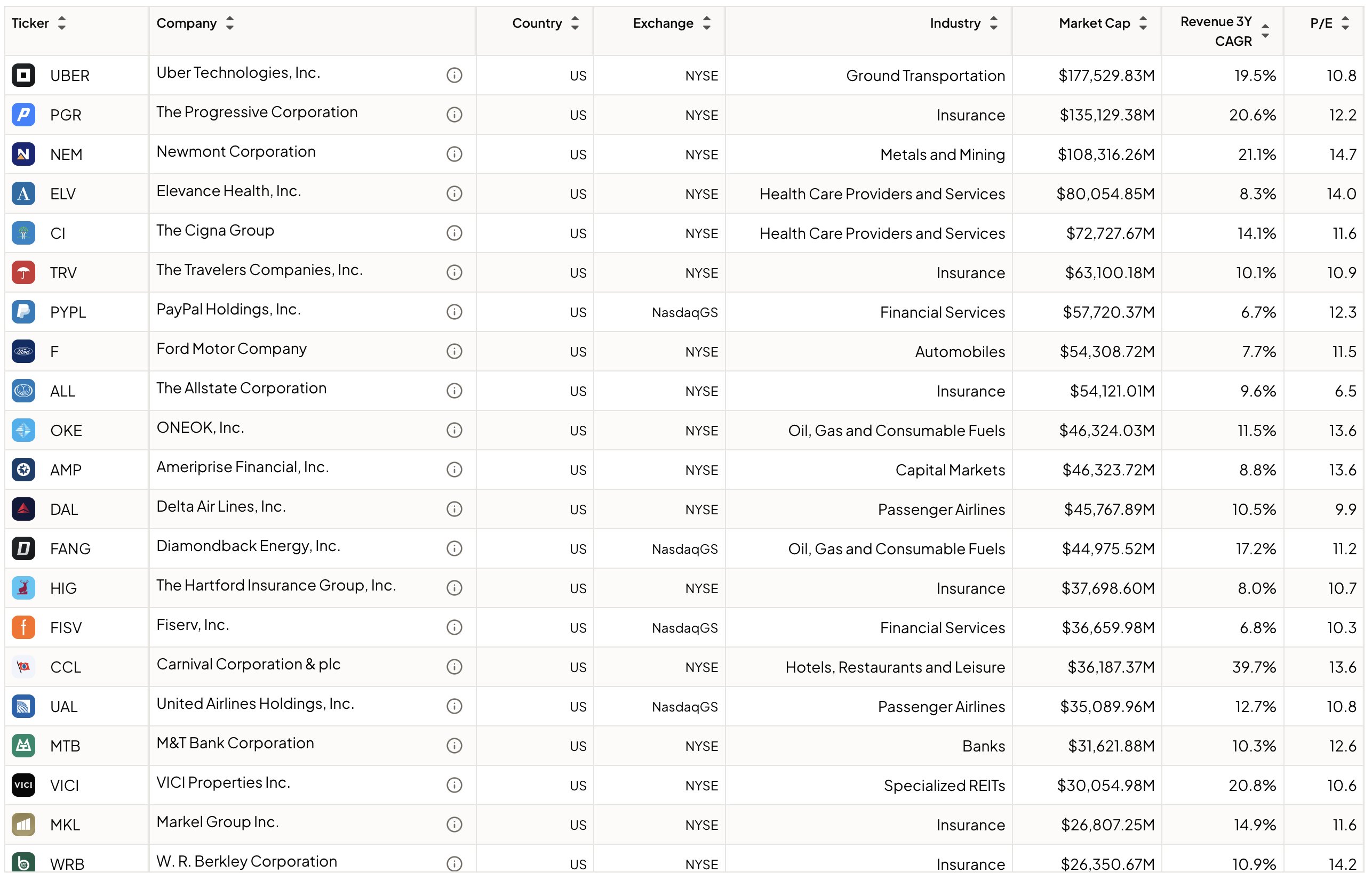 $Uber(UBER)$ $Progressive(PGR)$ $Newmont Mining(NEM)$ $Elevance Health(ELV)$ $THE CIGNA GROUP(CI)$ $Travelers(TRV)$ $PayPal(PYPL)$ $Ford(F)$ $Allstate(ALL)$ $ONEOK Inc(OKE)$ $Ameriprise(AMP)$ $Vici Properties(VICI)$ $Markel(MKL)$