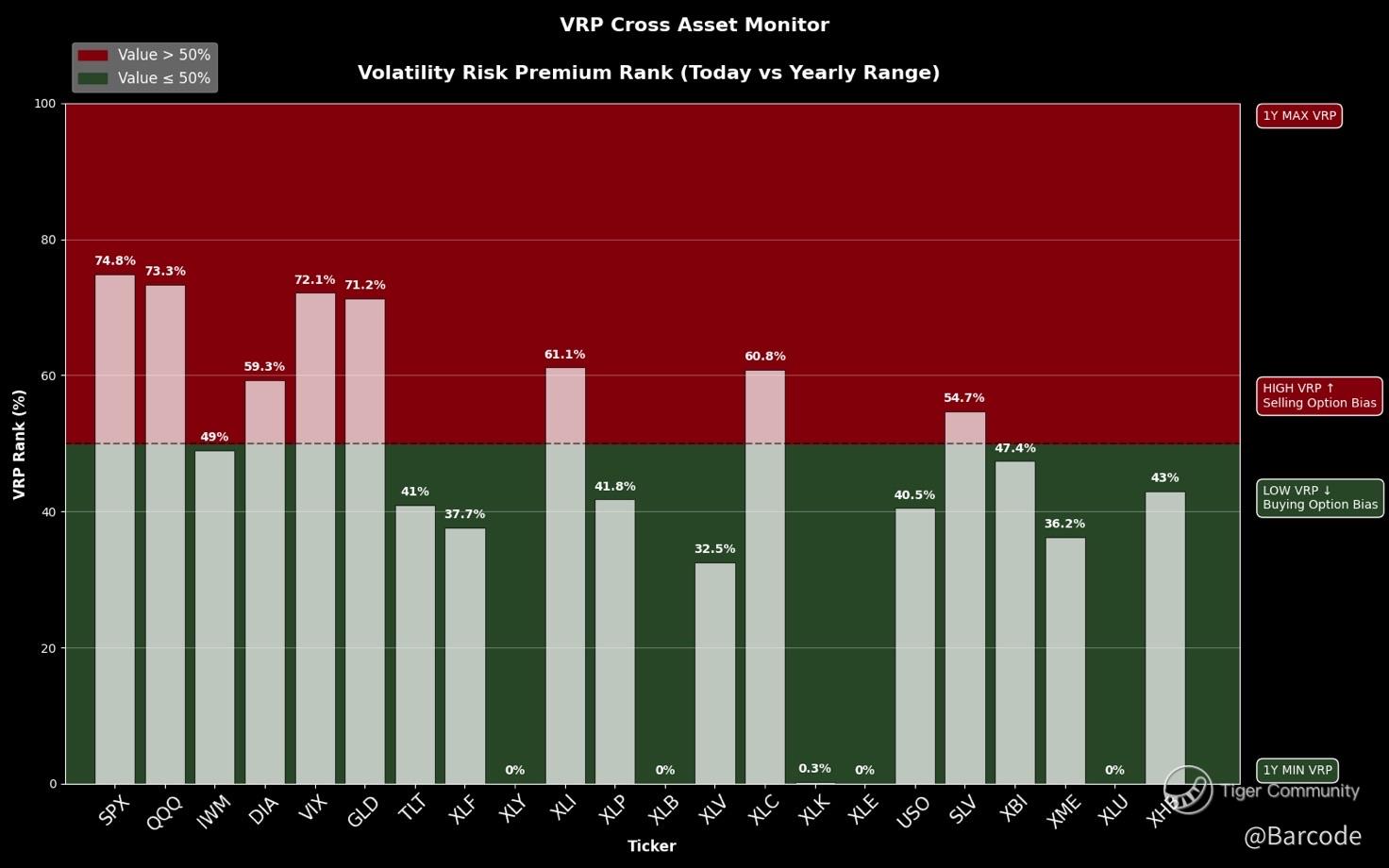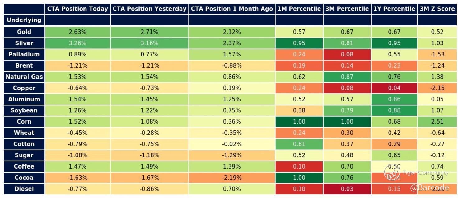 π€ CTAs continue to lean heavily into precious metals. Silver and gold remain the largest long exposures across the commodity complex, with silver and π½ corn currently leading CTA flows. This is systematic capital following trend, not discretionary chasing. At the same time, β οΈ silver is overheated from a volatility perspective. VRP remains firmly in the red, signalling elevated option premia and short-term crowding. Overheated does not mean bearish. It means pullbacks are more likely to be shallow, fast, and bought rather than evolving into structural trend breaks.