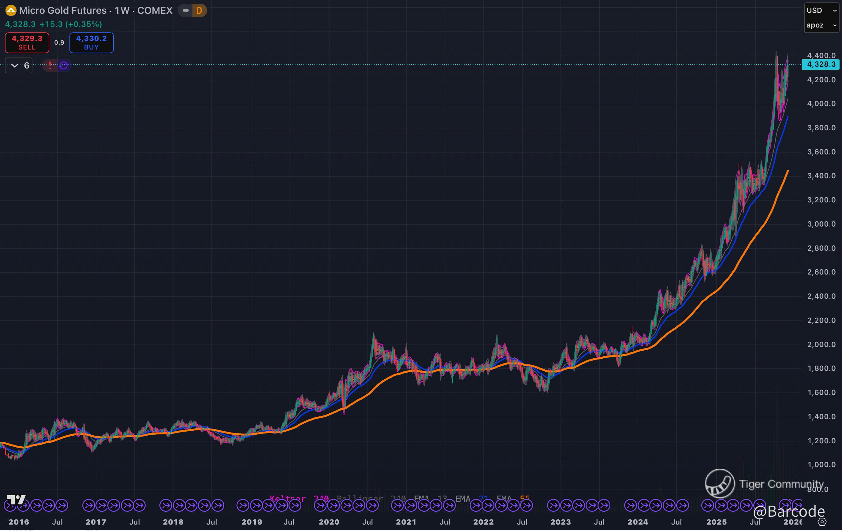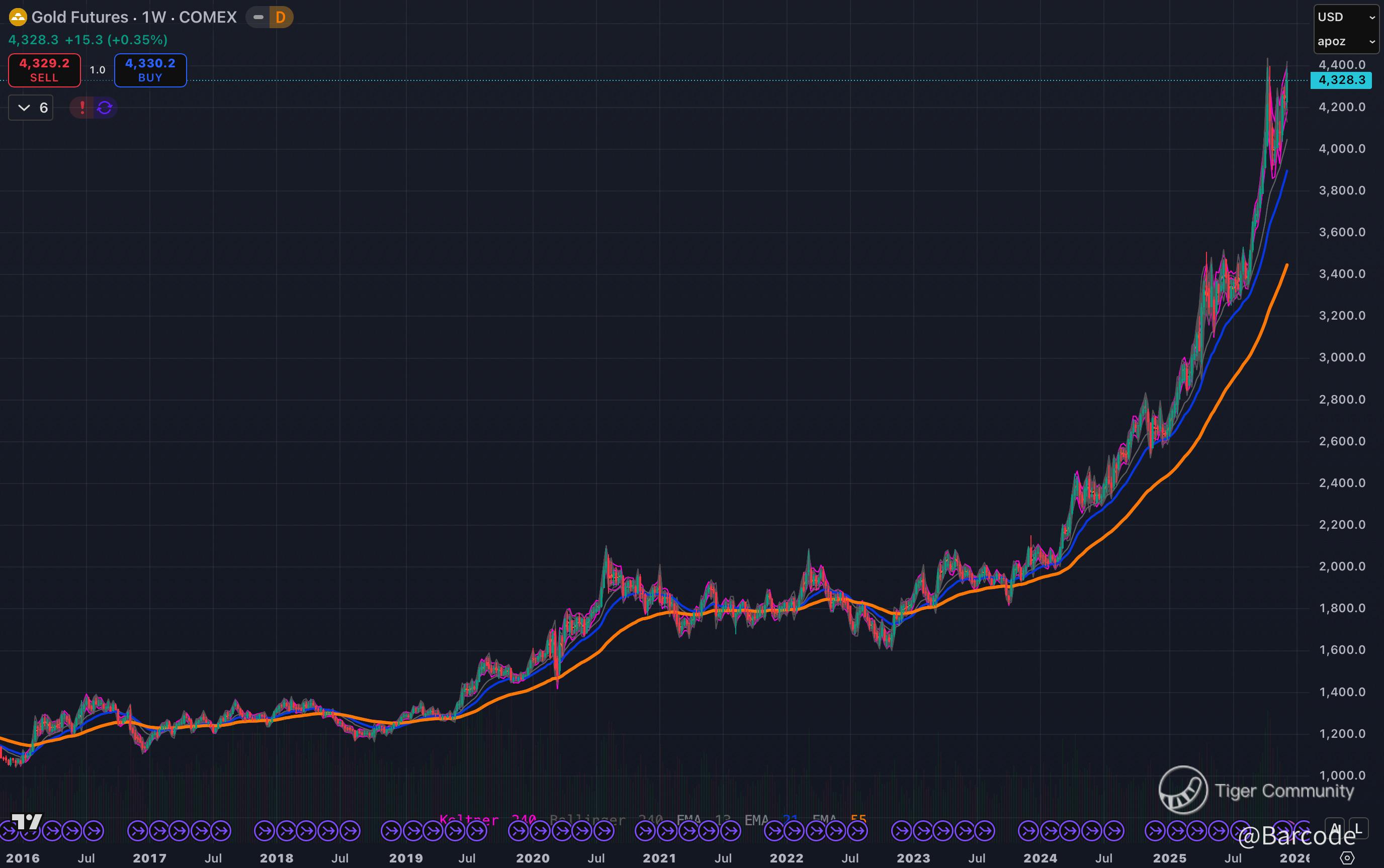 π‘ Gold futures continue to hold around the $4,330 region, forming what is effectively a structural fortress on the weekly chart. Price remains above rising trend support, with every pullback absorbed rather than rejected. That is not exhaustion behaviour. That is controlled consolidation following one of the strongest multi-year advances on record. Consolidation at elevated levels is how secular trends reset before extending.