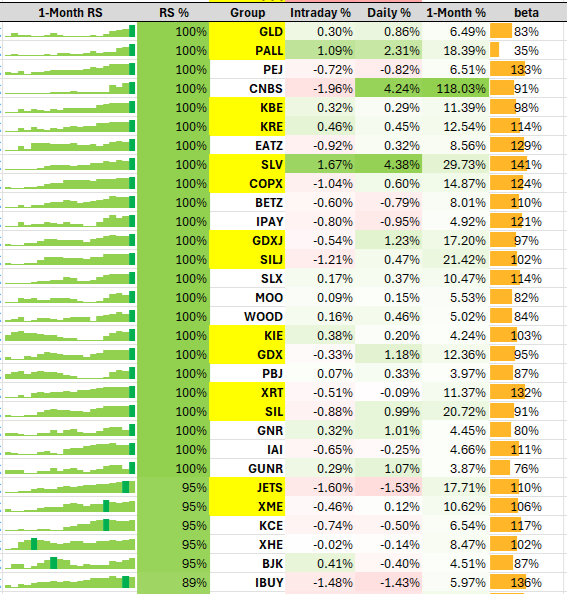 That said, there are still multiple pockets of relative strength emerging across the market. Some may feel discouraged after getting late stopped out across several positions today and choose to sit on the sidelines going forward, but this is precisely the period to put in extra post-market work—refreshing your watchlist and tracking emerging RS group names, especially those printing new RS highs despite yesterday’s selloff.