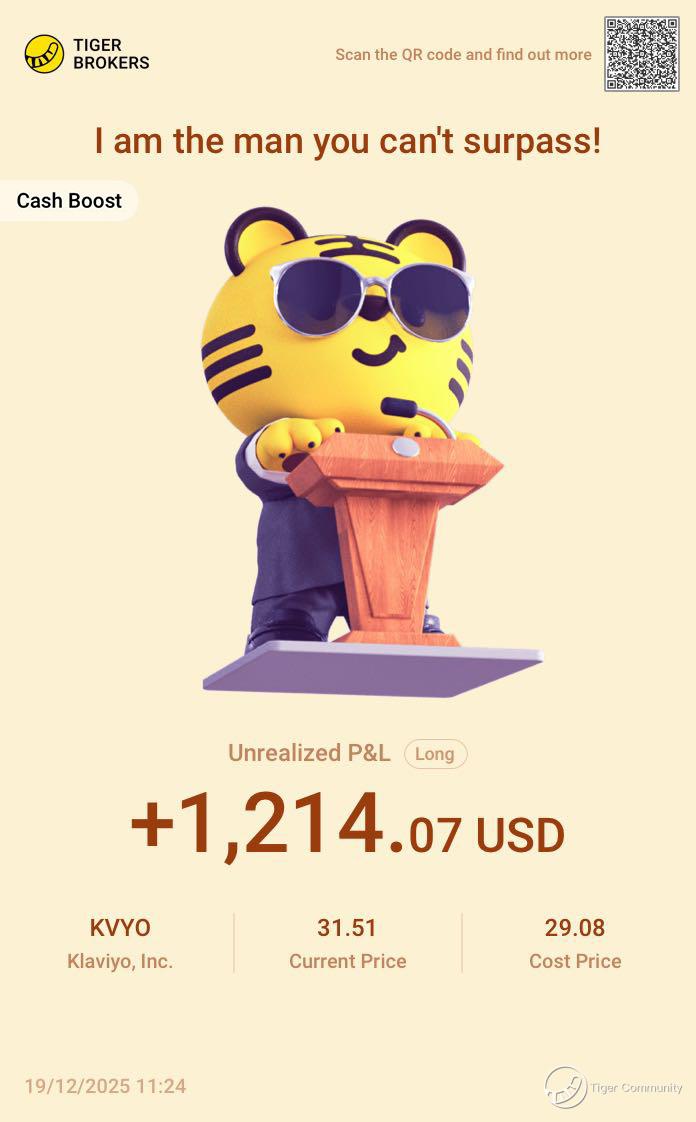 $Klaviyo, Inc.(KVYO)$ has been a pretty smooth ride. Demand for marketing automation and data analytics keeps growing, and KVYO has strong stickiness with e-commerce and SMBs. No crazy spike, just a steady climb — locked in a small but solid profit. Feels comfortable to hold and I’m happy to keep watching it play out long term.