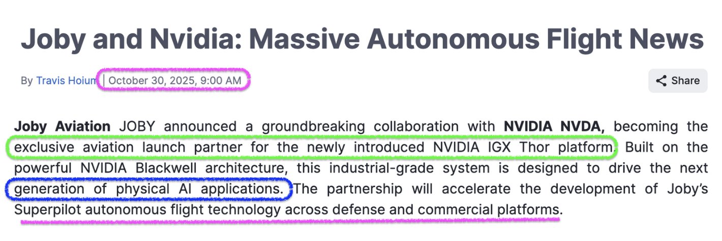 - JOBY + $NVIDIA(NVDA)$ exclusive aviation partnership