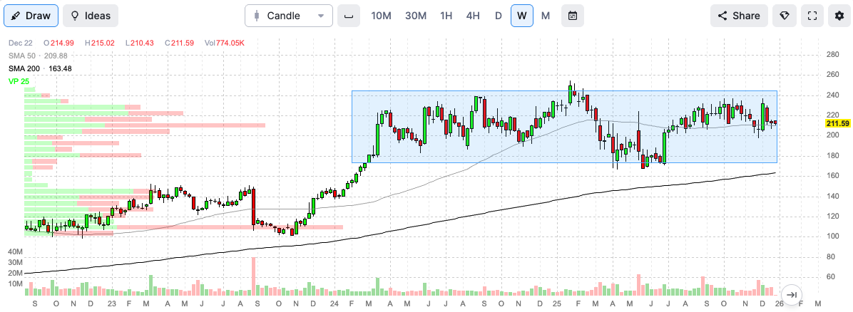 Price has been consolidating for two years now. Lower risk, longer term idea targeting $300.