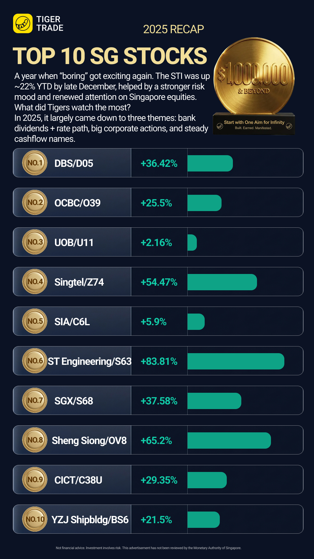 A year when “boring” got exciting again. The STI was up ~22% YTD by late December, helped by a stronger risk mood and renewed attention on Singapore equities.