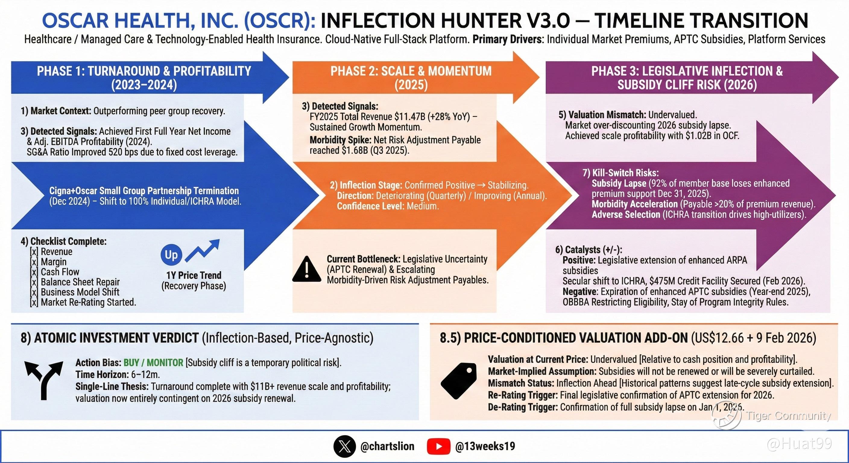 Oscar has reached scale profitability as a tech-native ACA insurer, but the stock is being dominated by fear around the 2026 subsidy cliff rather than fundamentals.